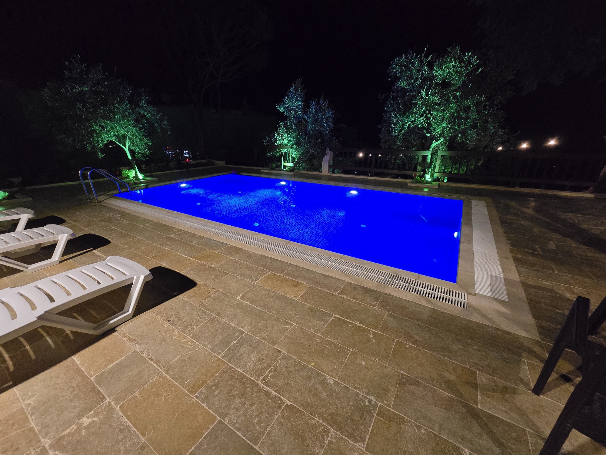 Vibrant lit pool and Green surrounding to catch your breath